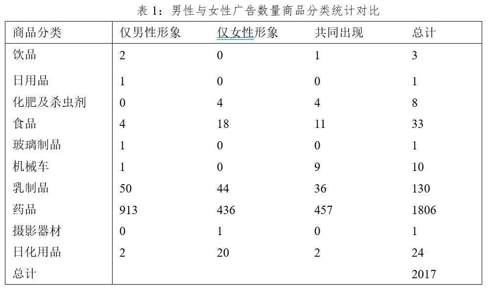 在CCAA数据库中,《越华报》相关广告数据共有3488条,其中含人物形象的有效数据共2017条,包括含有女性形象的1043条,含有男性形象的1494条,其中同时包含男性与女性形象的广告共520条。《越华报》中的外国商品广告中男性形象是数量几乎是女性数量的1.5倍数,说明这些广告更倾向于选择男性形象作为形象代言人。对于两性广告形象的数量对比,我们还分商品类型做了统计(表1)。由于《越华报》外国商品广告中收录了大量的医药产品广告,我们发现,此类商品的数据对总体数据的性别比例产生了很大影响;但在日用品和食品两类商品广告中,女性形象超过了男性形象的数量。