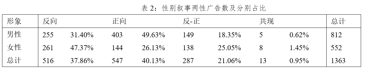 在全部2017个样本中,可以进行正向/反向叙事相关标注的有效样本共1363条,包含女性相关样本551条,男性相关样本812条;男女共现的广告中男性和女性形象做了分别统计;男性与女性样本总数的差距与样本总数有关。如表2,这组数据显示,在《越华报》外国商品广告中,男性和女性形象表现为由反向到正向、或正反共现的情况数量大致相同,二者差别主要体现在正向和反向叙事上。男性形象更倾向于被描述为积极形象,正向叙事大约是反向叙事的1.5倍;相反,女性形象更容易被描绘为消极形象,反向叙事大约是正向叙事的1.8倍。以上数据全部经过卡方检验,检验结果显示P=0.000,表明我们至少有95%的把握认为性别形象与叙事手段有关。