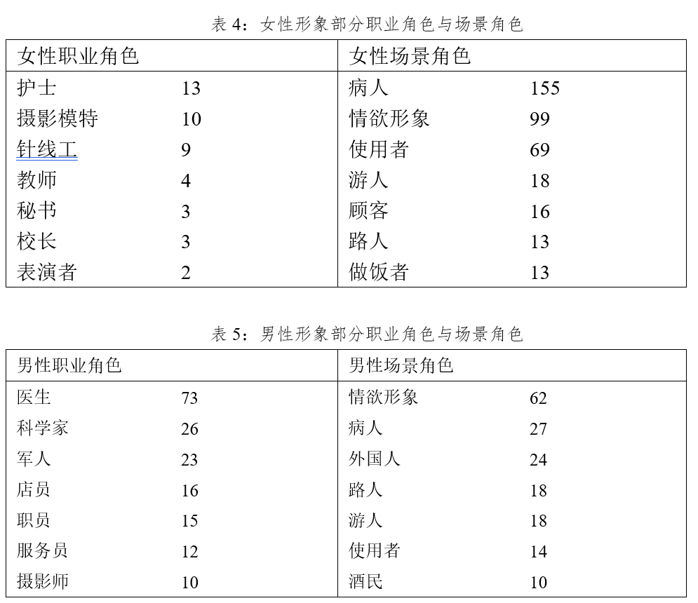 在职业角色与场景角色方面,在本研究的标记中,共出现103种角色,其中职业角色58种,场景角色45种。从性别角色来看,女性职业角色11种,场景角色29种;男性职业角色48种,场景角色32种。“病人”、“情欲形象”、“使用者”、“医生”是出现最多的人物角色,这与全部样品广告中所包含的药品广告占比最多有直接的关联。表4与表5展示了男性与女性数量最多的前七种职业角色与场景角色。