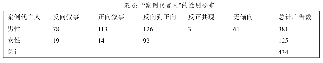 在标注中我们发现,以 “韋廉士醫生藥局”广告为代表的药品广告常常以使用者的经验分享作为广告的内容主体,为体现药品对于疾病真实的治愈作用,广告文本中常常会加入“案例代言人”具体的社会身份(如“某地某职某某君”)以增加可信度,因此在统计结果中出现了丰富的男性职业角色。由于在相关药品广告中使用男性形象更多,因此统计结果中男性的职业角色较女性更为丰富。不过民国作为职业女性群体新兴壮大的历史时期,为何女性的职业角色在结果中的表现不甚明显,这个问题引起了我们的注意。我们将在下一章中对这一现象做进一步的探讨。表6为“案例代言人”的性别分布及叙事倾向统计。