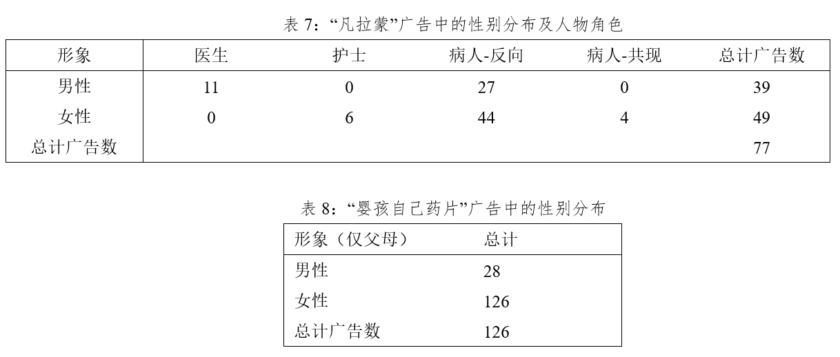 在上一章的结论中,我们曾经提到广告中的男性叙事更倾向于正向,女性叙事更倾向于反向。这样的一种特征在广告的具体呈现中意味着什么?个别的商品广告案例是否仍然符合这一特征?为了解答这些疑问,我们以药品广告中的“凡拉蒙”为例进行考察。由于这是一款缓解疼痛的药品,我们重点选取了标注中的“医生”、“护士”、“病人”作为关键词,以考察正反叙事在疼痛与疾病的语境中所存在的性别差异。如表7所示,在这款商品的77条样品广告中,作为反向叙事出现的女性“病人”数量大大超过了男性“病人”,符合总体样本的叙事特征;与此同时,“医生”的形象全部由男性组成,只有少数女性以“护士”的形象出现。疾病与女性之间这种更加紧密的关联可以说是一种对“男强女弱”传统观念的现代演绎。东汉班昭的《女诫》开篇便以“卑弱”为题,而“卑弱”作为封建时代女性的代名词,也是支撑“男外女内”家庭模式形成的关键因素,造成了劳动分工和权力关系的不平等。到了民国时期尽管有不少女性走上职业道路,但是对女性“贤妻良母”的要求却似乎从未退场。如表8所示,在“婴孩自己药片”的所有126条广告样本中,每一条都有母亲形象的出现,父亲形象却只出现了28次,足见这种观念的根深蒂固。