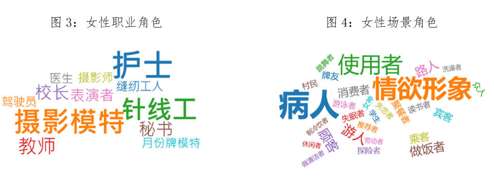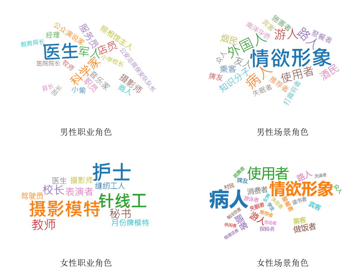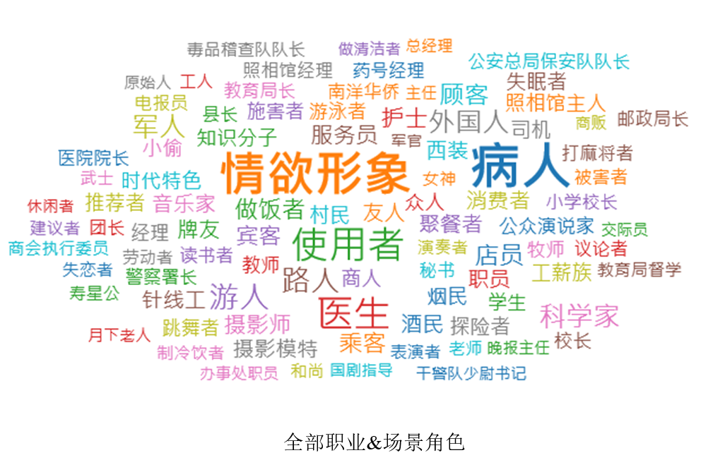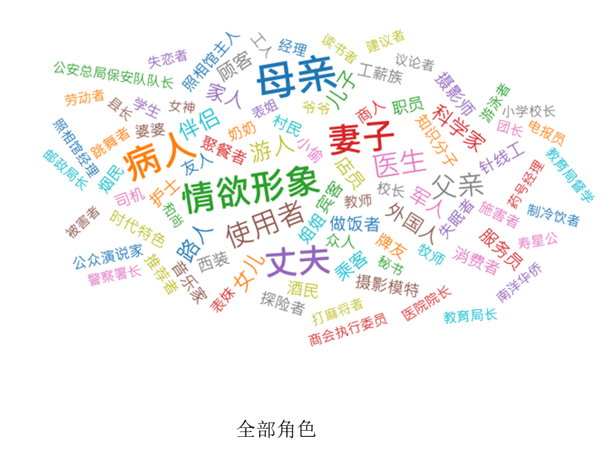 在人物角色方面,我们将男性与女性的标注角色分别按照家庭角色、职业角色和场景角色进行统计,并利用DocuSky平台和标记工具Content Tagging(CT)生成了词云(见附录)。统计数据表明,整体来讲,男性形象的社会与场景角色更加丰富,而女性形象的家庭角色相对更多。