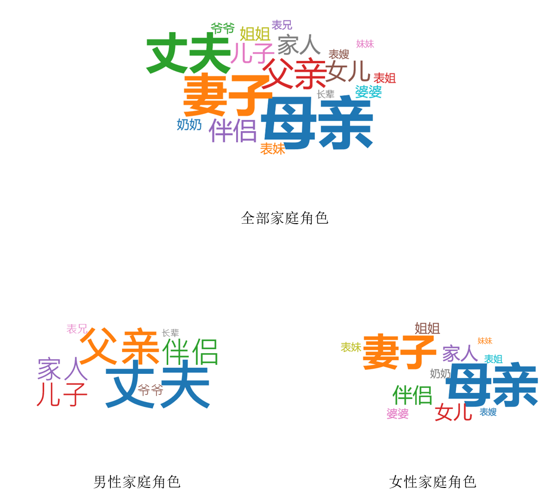 在家庭角色方面,“母亲”、“妻子”的出现频率最高,“丈夫”紧随其后。在角色种类上,女性的家庭角色在呈现上虽较男性略为丰富,但总体上二者趋于均衡;在数量上,女性的家庭角色形象相对较多。