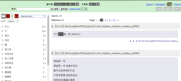 (1)使用DocuSky“标记与词条统计分析”工具,从DocuSky中添加已标记新工人乐团歌词文档。