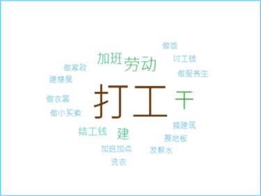 当我们看到“做家政、搞建筑、建楼房”这类词的时候,发现他们并没有具体的名称,如“建筑师、建筑工人、家政工”,反而都是用大白话表达了出来。这样的表述,既能够贴近打工群体,也从侧面反映出,“家政工、小时工”这类的称呼并不被打工群体所接受,正式的表述很难得到打工者的认可,他们对自己的职业也缺乏认同。
