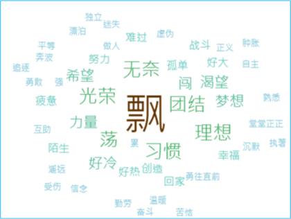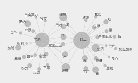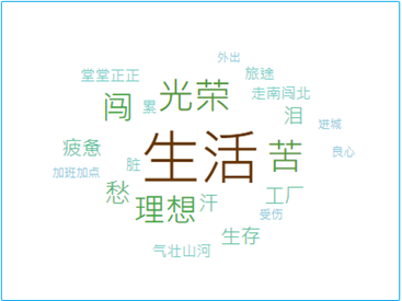 从整体的工作状态的词表来看,新工人乐团的歌曲中,积极的状态和消极的状态对比十分明显。这也体现在打工与劳动的关系中,下文会有具体的分析。歌词中,积极的情绪主要表现在为理想奋斗,为生活斗争这类理想的状态里。而消极的情绪则用于反应现实工作的诸多压力和不顺意。在两种情绪的强烈的对比中,更体现出新工人乐团的坚定的信念与立场。