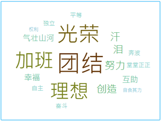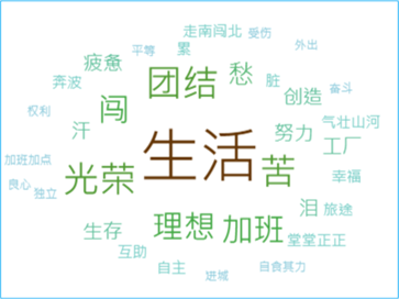 在歌词中,提及劳动时总会与团结、光荣、理想之类的词放在一起,其中团结出现了25词,光荣出现23词,可以看出劳动在新工人乐团歌曲中的位置。与之相关的还有幸福、自主、创造、互助、独立、权利、平等、理想、奋斗,可以说劳动代表了打工群体的美好愿景,给予了十分重要的意义。劳动是光荣的,劳动者是光荣的,通过社会平等、权利的保障、团结互助,就可以实现一个美好的社会。新工人乐团要争取的,也是一个最基本的权利,能够堂堂正正做人,安安稳稳做好自己的本职工作。但是劳动也并不完全是积极的,其中也需要付出汗水与努力,在歌词中也与加班联系在了一起。