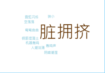 除了“家乡”与“城市”,歌词中提及的另外两个方面就是在城市打工的工作环境以及居住环境。在工作环境方面,表达较为具体,比如矿井、臭水沟、流水线、工厂、工业区。而打工群体生活的另一个重要方面就是居住环境,比如宿舍、地下室、出租房、平房、棚户。在论及工作环境和居住环境时,也都有明确的形容词来形容工作和居住的情况,其中最明显的特征就是脏、拥挤。