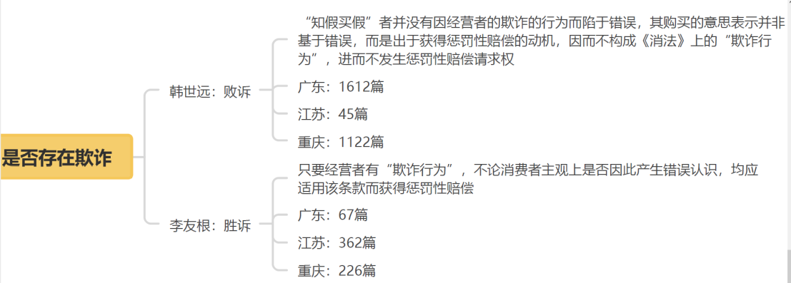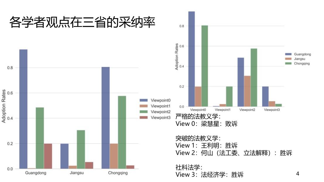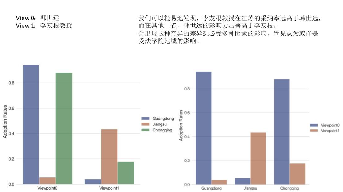 进行初步统计,我们发现观点采纳的地域倾向分布得非常极端。在相关案件数量比较多 、 比较有统计意义的广东重庆江苏三省中,江苏采纳李友根教授观点的比例可以称得上畸高。为什么呢?可能是受到各家法学院地域的影响,李有根系南大法学教授 ,韩为清华教师由此观之, 清华的全国辐射力高于南大,而南大的江苏影响力可能高于清华。