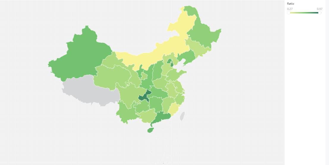 通过对学科通识的整理,我们不难发现,法院使用的裁判方法与其立场高度相关 。保守的解释学方法将会导致打假人败诉的判决,而激进的司法取向将会导致打假人胜诉之结果。 因此统计全国各省份职业打假人胜诉比例其实就可以刻画出法院的裁判取向,进而反应法院对立法机关的态度取向如何。由此我们不妨可以观察胜诉判决比例的地域变化: