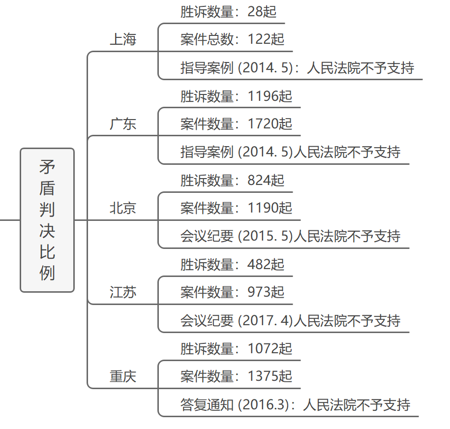方法:查询若干代表省份地方法院的会议纪要给出的态度,统计各省案件数及胜诉数,观察矛盾案件数量 。