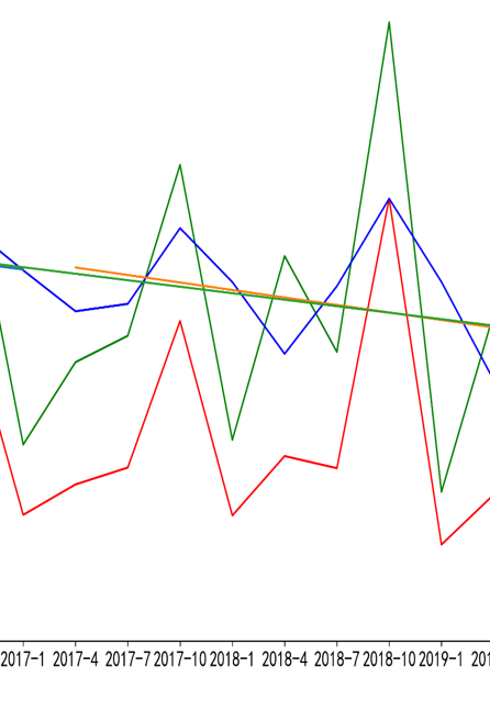 (C) 方法:统计全国相关案件中职业打假人成功比例随时间的变化,对14-17年及17-20年的数据分别作线性回归比较趋势(图四)
