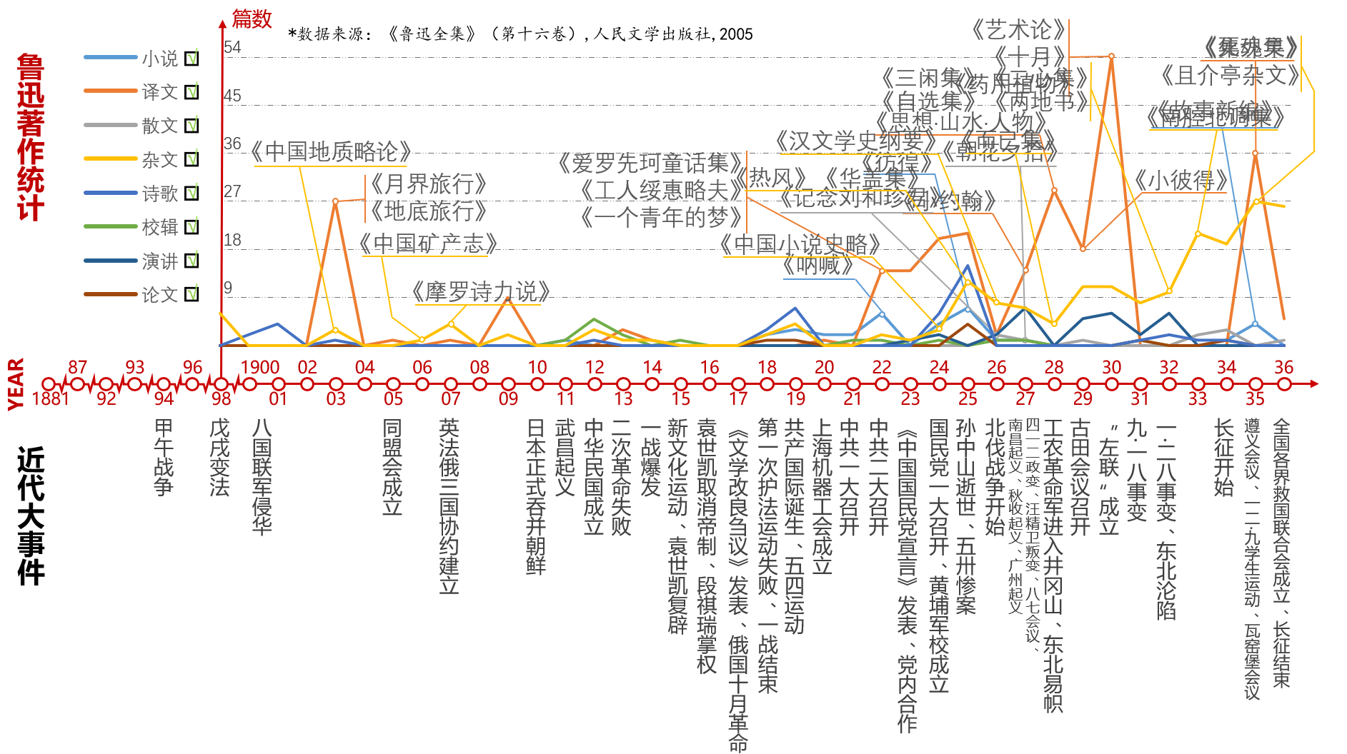 鲁迅译著统计图数据可参见《鲁迅著译年表》(孙自筠 作),人民文学出版社《鲁迅全集》最后一卷。和《鲁迅全集》的目录相比,《鲁迅著译年表》按年份一一列出其发表的篇目,《鲁迅全集》的目录则是按照出版的书籍进行分类,并没有进行序时,故而不符合我们的标准。值得注意的是,我们以篇目作为统计单位,因而鲁迅的翻译作品若是一本的,当作相关数量的篇目衡量。