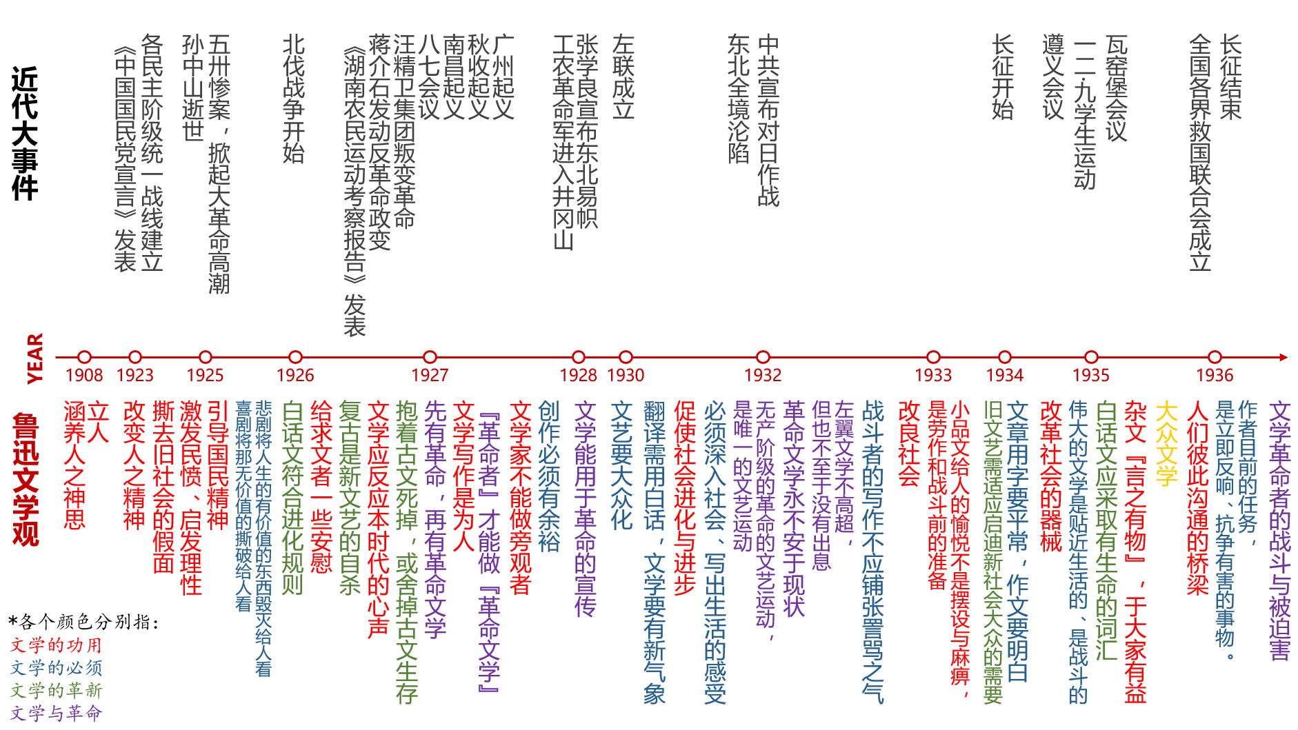 一者是鲁迅文学观之变与不变。我们将引文主要概括和划分为文学的功用、文学的必须、文学的革新、文学与革命(左翼文学)这四个方面。图中用不同的颜色对这些方面进行了划分。
