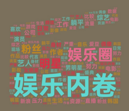 对13695条娱乐内卷的词汇进行分析,得到词云图和动词关键词词云图(图8)。在关键词词云图中,发现内卷存在于各个行业,包括但不限于手机行业、家政行业、食品行业、新能源行业、平台产业和养殖业,就连医疗行业都深受内卷迫害。这种内卷还少量存在垄断行业之中,因为保有垄断地位,一些行业就会有恃无恐,肆意的压榨旗下员工,以实现企业利润最大化。对动词进行分析,可以发现此时,人们对内卷的态度近似于2020年之前,回到了经济领域。