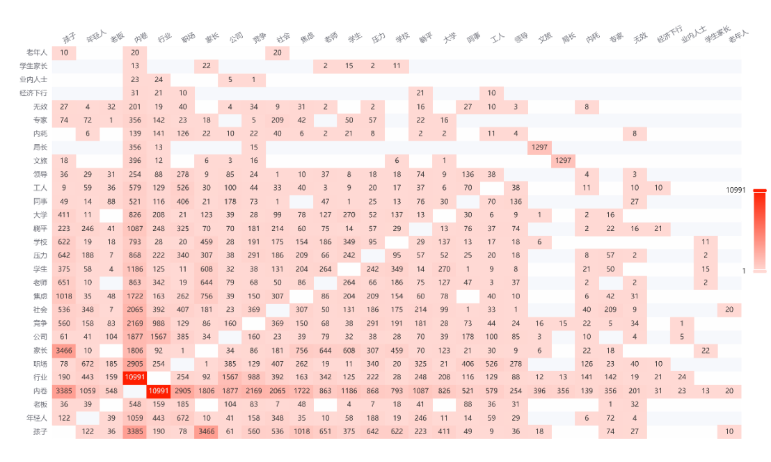 数值越高则相关性越高,可以发现内卷与行业等词汇的相关值最高,说明行业内卷的状态最为明显且为人津津乐道。而在焦虑一行中,数值最高依次是内卷、孩子、家长,结合内卷一列的数据可以说明在教育内卷的语境之中,焦虑是常见状态,但是最长出现焦虑的是学生,其次是家长。而在躺平一词汇之中,行业与年轻人的相关数值最高,可以说明在职场内卷之中,存在躺平心理的多为年轻人。在其余领域之中,相关性则没有可论述之处。