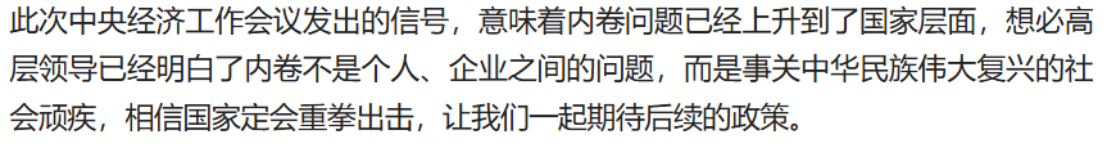 此处可见,出现的关键字围绕行业、企业、竟争等,教育相关内容相对次要,此处或因用户年龄层不同导致关注焦点不一。其次“自己”、“大家”、我们等字眼亦是出现频率较高的字眼,反映个体除了期待官方的政策外,“大家都很累”、“摘到自己的节奏”等字眼反映大众除了关心经济外,亦相当关注自身在内卷的潮流中如何自处。