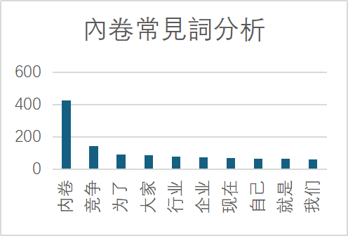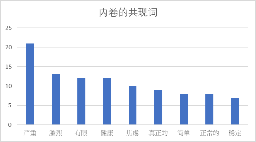此处小组亦尝试虚招内卷的共现词,并把相关形容词摘除,从而更能得悉大众对内卷之态度。图中严重、激烈等词形容内卷的严重性,而焦虑等词亦可看见大众对内卷之负面态度。健康代表大众关注内卷对个人健康之影响。