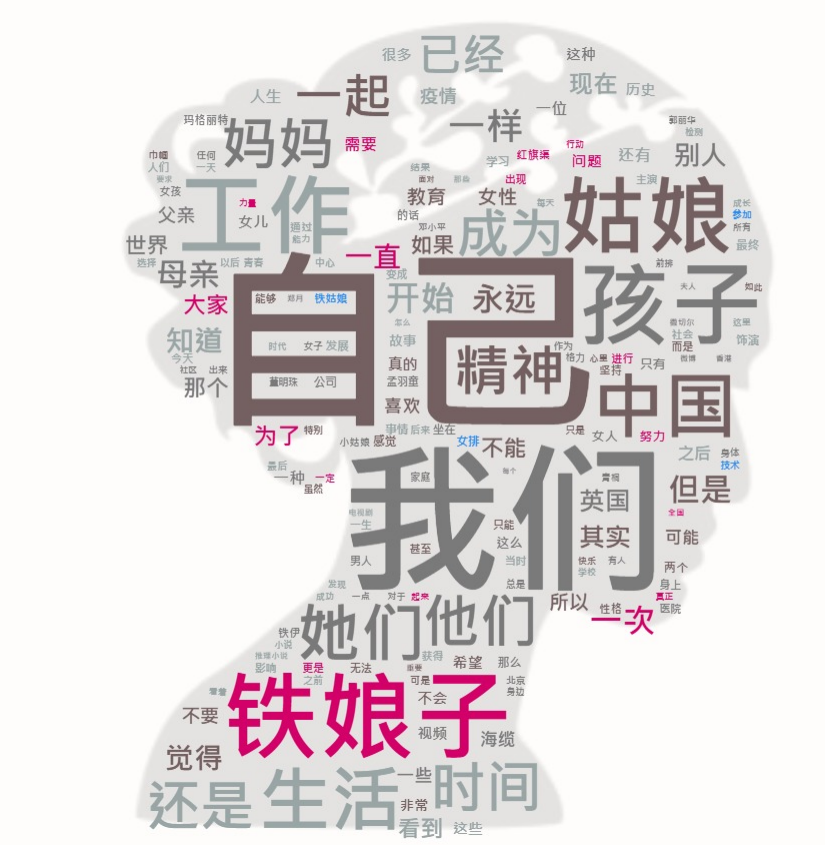 1、这意味着铁娘子从描述精英的标签,转变为普通女性自我描述的身份标识,融入日常生活。这是最深刻的转变。其最高频共现词不再是任何具体公共人物或领域,而是自己”(557)、“我们”(409)、“孩子”(255)、“工作”(251)妈妈(132)、母亲(103)、努力(70)、女儿(75)家庭(62)