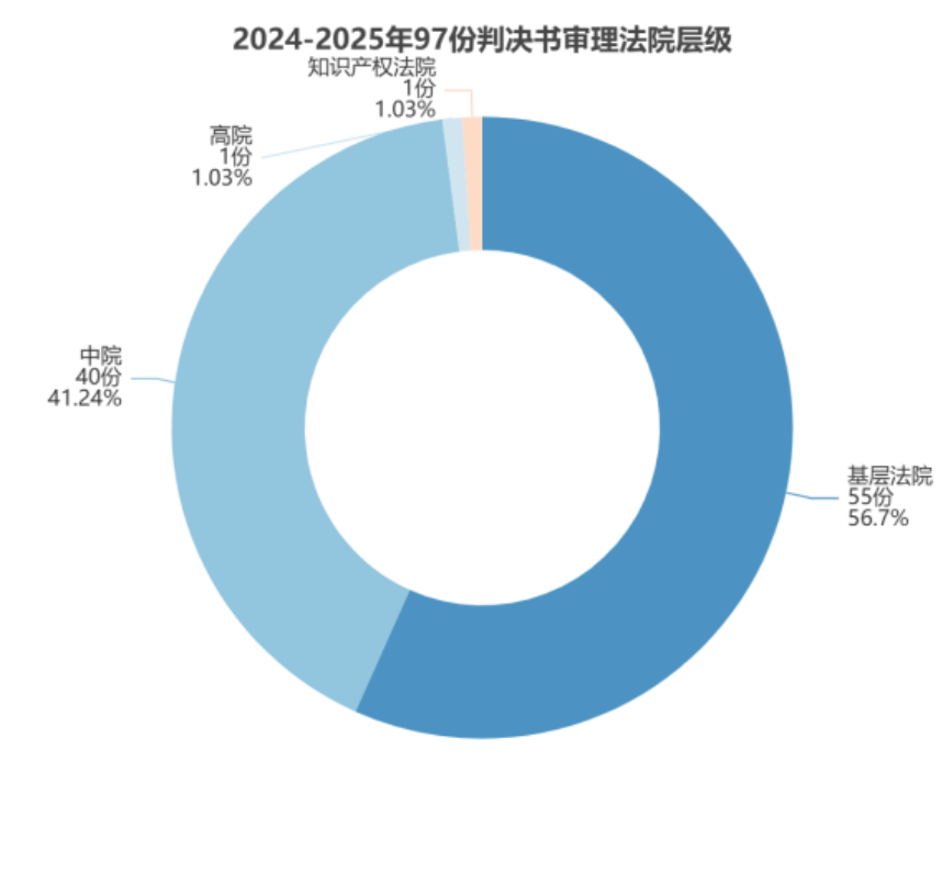 在97份有效判决书中,由基层人民法院作出的判决共55份,占总数的56.7%;由中级人民法院作出的判决共40份,占比41.2%;由高级人民法院和知识产权法院作出的判决各1份。这一分布与我国民事案件的级别管辖实践基本吻合:绝大多数一审案件由基层法院审理,而上诉案件主要由中级法院处理。