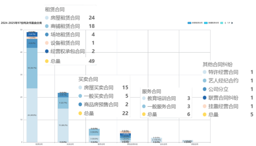 租赁合同纠纷:共49件,占比50.5%。其中进一步细分为:房屋租赁合同24件,商铺租赁合同18件,场地租赁合同4件,设备租赁合同1件,经营权承包合同2件。