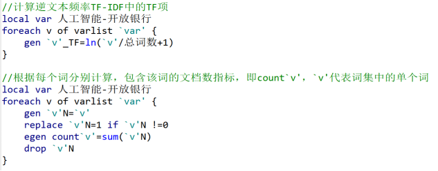 定义了一个变量列表,里面包含所有数字化相关的关键词变量(从“人工智能”到“开放银行”)。对每一个关键词,计算:TF = ln(某个词出现次数 / 总词数 + 1)
