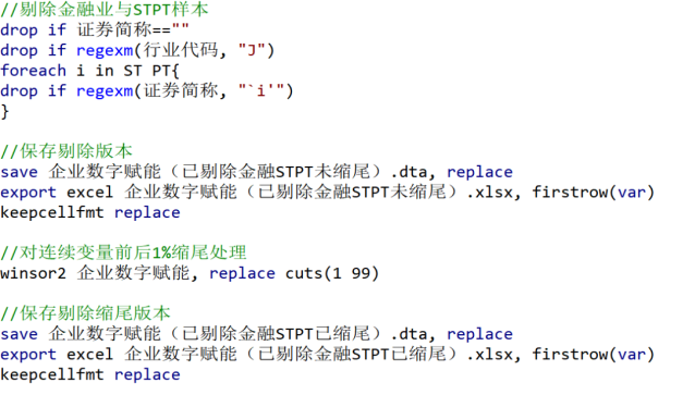 删除证券简称为空的行。删除金融行业(行业代码包含“J”)。删除ST和PT股票(这些是财务有问题的公司)。对“企业数字赋能”变量进行缩尾处理,去掉最高和最低的1%极端值,防止异常值影响分析。保存最终的数据集。