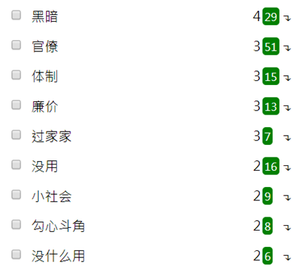 标注结果显示,知乎回答和主流网络社区中的回答在基本评价上持相同的态度,坦承学生会的“黑暗”和“官僚”。在对这两个词条进行简要的语义分析后,笔者也能够基本判断出其中反义的用法凤毛麟角,如“黑暗”一词在全文中的29处出现,只有2处是用于反对学生会黑暗的说法。另有“过家家”“没用”“小社会”“勾心斗角”等评价,都是在指责学生会不良风气所产生的负面影响。