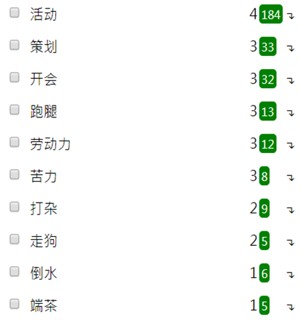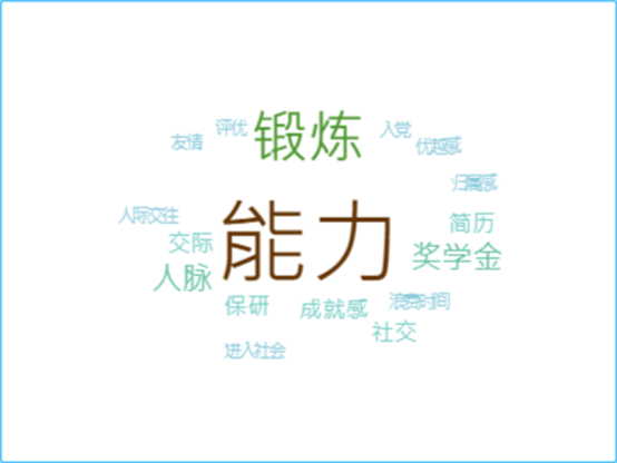在具体作用和工作内容的标注中,笔者既标出了较为模糊的形容,也标识了一些比较详细的说法。例如,具体作用中的 “能力”“锻炼”“经历”乃至“归属感”等等都较为模糊,“奖学金”“入党”“保研”等则属于相对明确的“好处”。