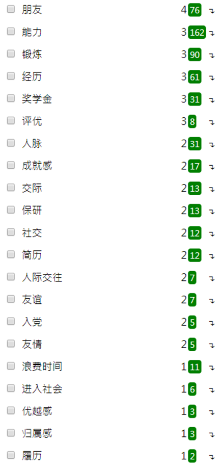我们能够看出,尽管学生会的工作内容被形容为吃力不讨好而又缺乏技术含量的“苦力”“跑腿”“端茶倒水”,但是它也存在着一些切实的好处,如“奖学金”“保研”“成就感”等等。因此我们可以初步地论断,学生会工作虽然内容单调,但加入学生会的确有益于学生在校内争取一些短期利益。不过学生会以及校内利益显然并非高校学生的最终目的,“能力”“锻炼”“人脉”“经历”等用词很明显地展示出学生会阅历更为重要的面向,这些模糊的词汇既是当下个人企业化的鲜明表现,又揭示了大学与工厂之间壁障的消失。高校在成为就业市场的中转站之后,知乎答案对于学生会作用的体认实质上已经呈现出一种清晰的趋势,即高校学生已经将就业市场的要求奉为圭臬。