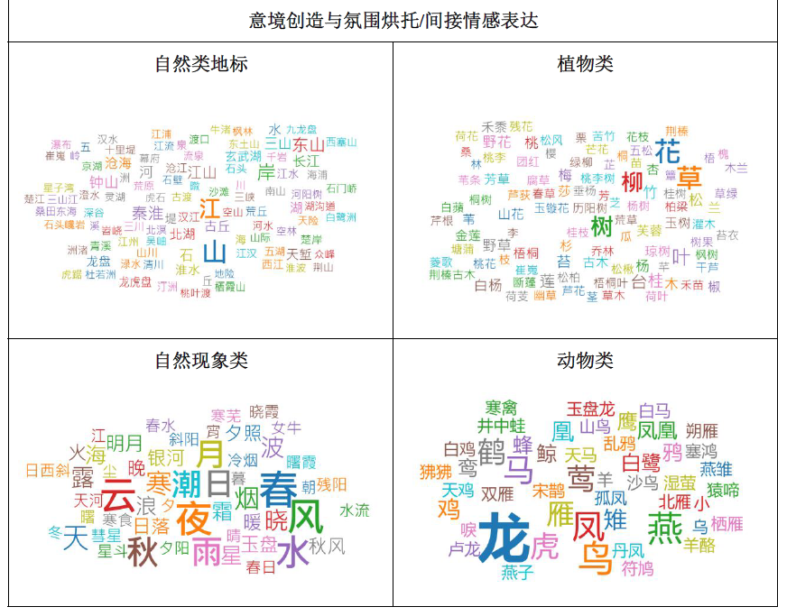 第一类代指金陵或表达特定含义的意象,与金陵强相关,包括金陵代称、自然类与人文类地标和其他金陵意象。第二类为创造意境、渲染烘托氛围的意象,是一种情感的间接表达,包括自然现象类、时间类、植物类、动物类、历史人物类和颜色类等。最后一种是直接表达感情的意象,通常为情感类词汇。