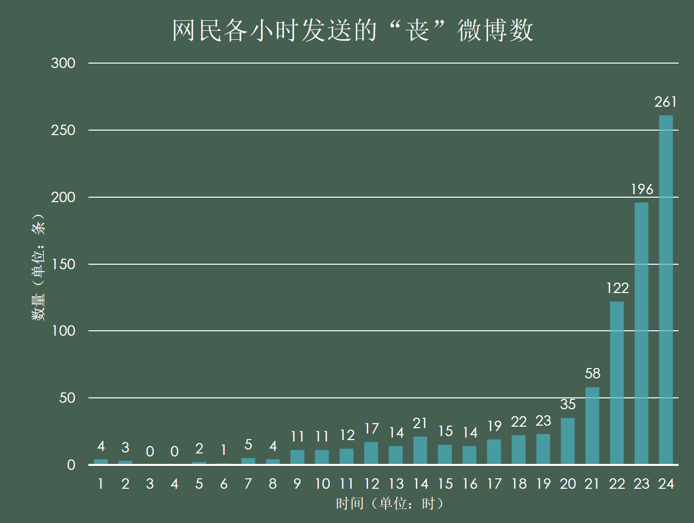 从柱状图中可以看出网民“丧”微博主要出现在晚上9点至0点这个时间段内 。