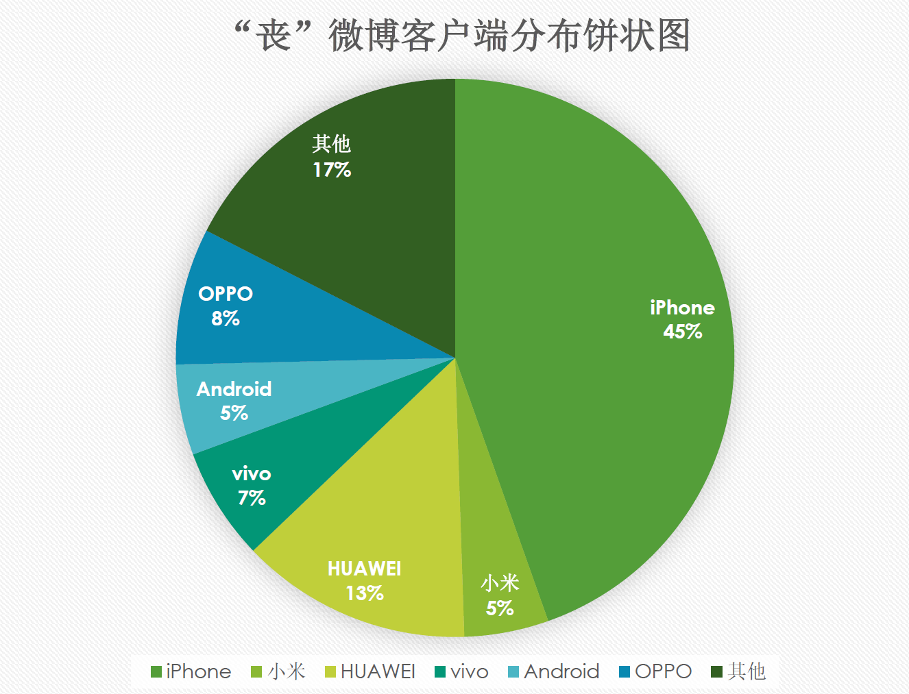数据显示“丧”微博的客户端分布呈现出了明显的偏向:iPhone占了所有客户端的45%。显然“丧”文化更受 iPhone用户的欢迎或者“丧”文化本身便是一种带有中上阶层品味的文化现象。