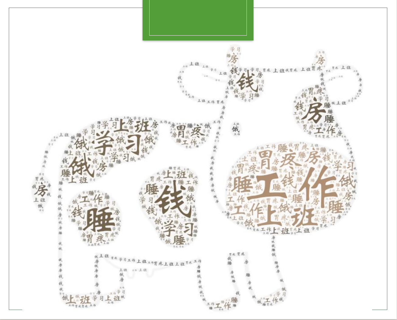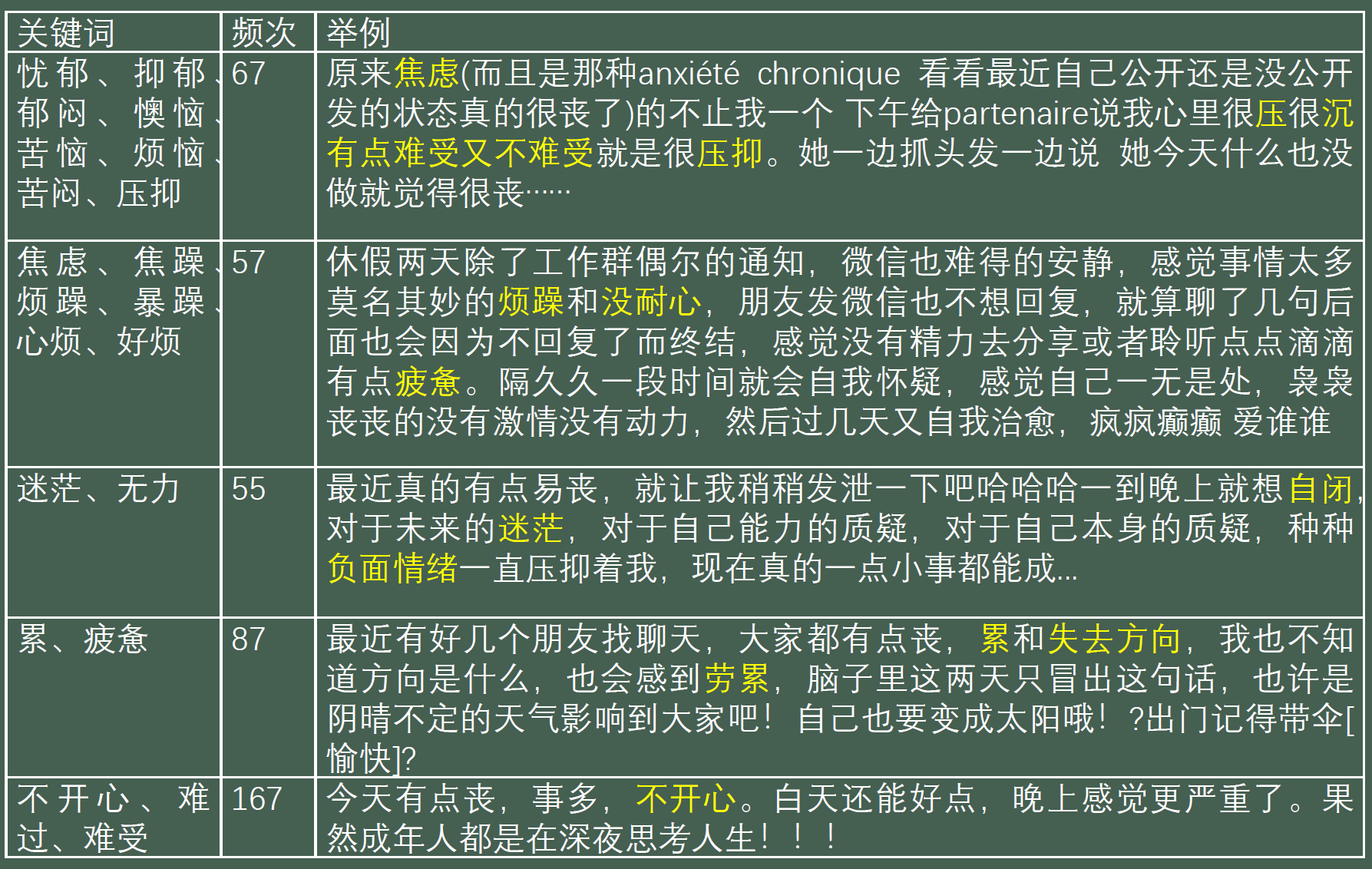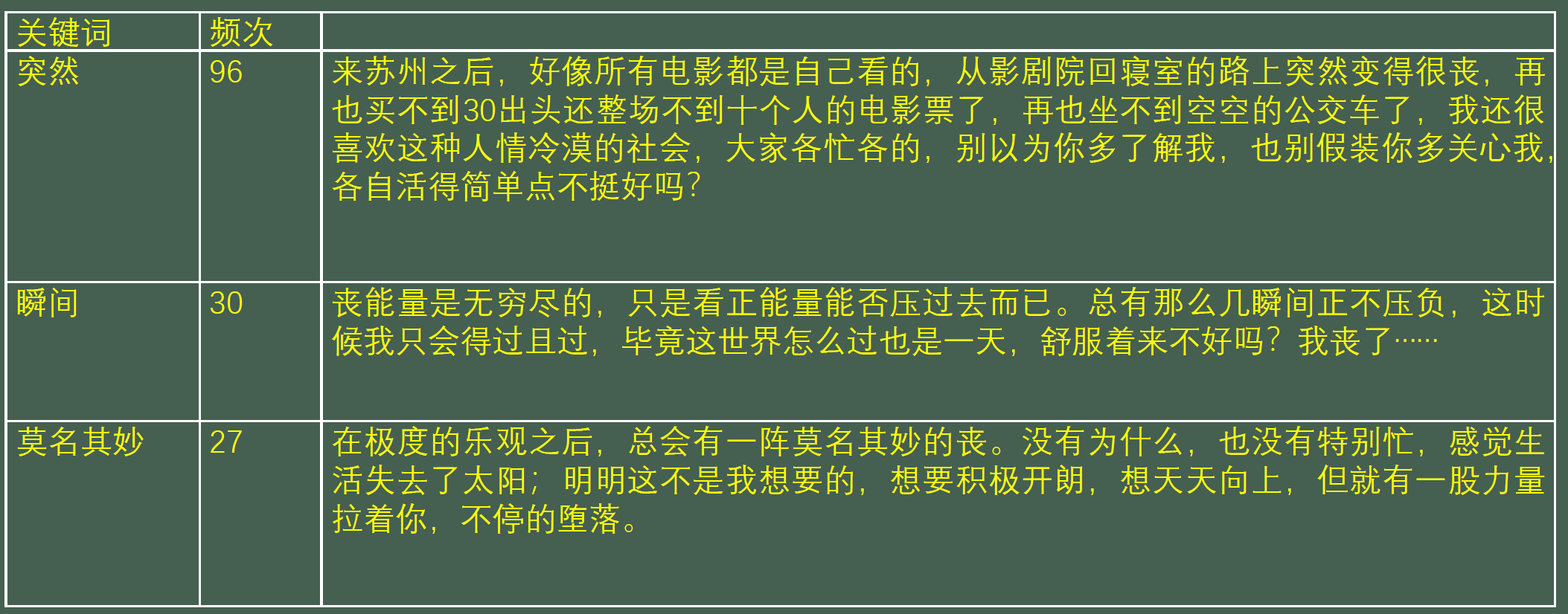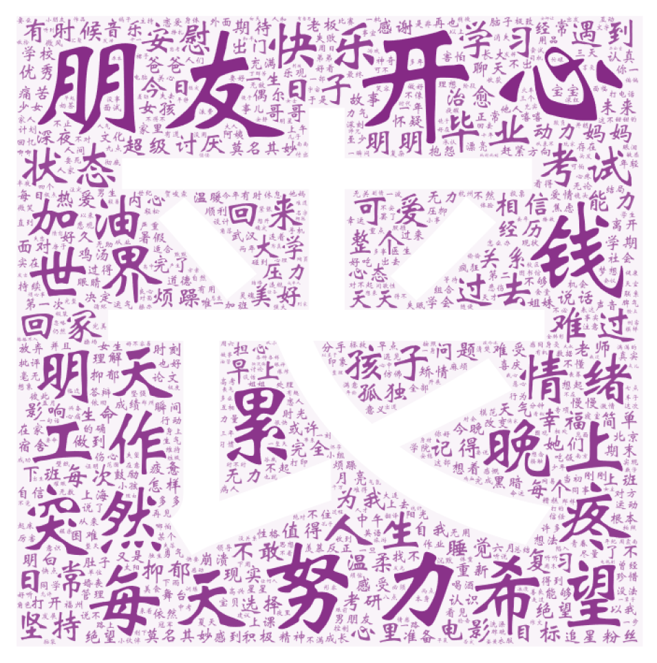 从词云图中可以看出来,作为一种情绪“开心”出现的次数最多(根据词频统计的结果“开心”出现了180余次,“不开心”出现了60余次)。紧接其后的是“希望”“努力”“加油”“快乐”“幸福”“美好”等,这些正向的词汇的高频率使用,同“丧”本身形成的极为强烈的对比。而负向的词汇,如“累”“难过”“孤独”“压力”“抑郁”等出现的频次要少得多。